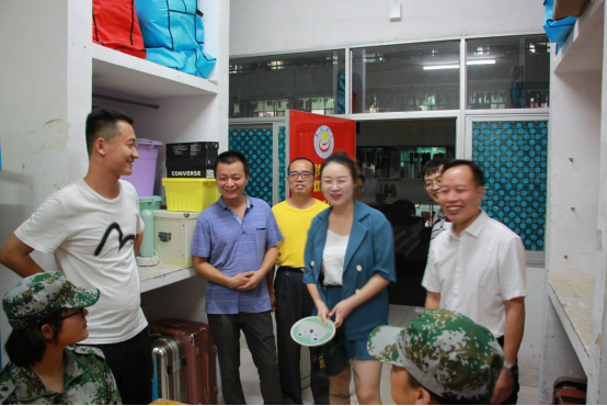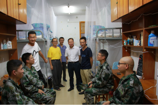 新生军训指导员王喜元向各寝室新生介绍了学院领导及班主任老师。李爱华书记对加入软件学院大家庭的2019级新生表示热烈的欢迎。他表示同学们能相聚在这里便是一种缘分,希望同学们能够好好珍惜同学情,平时相互协助,在军训期间及学生生活上有什么困难及时寻求班主任及学工办老师的帮助,由于军训期间正值天气炎热,李书记希望大家不留长发,以免感冒