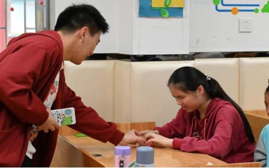 图为刘乐同学参与学院当党日活动去特殊学校教导学生
