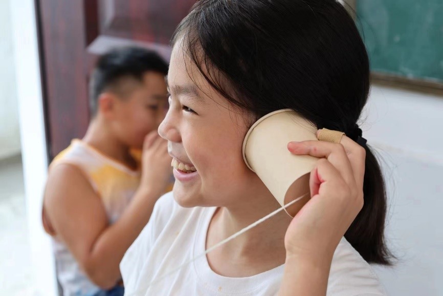 下午的课程涵盖了DIY制作和科学理论课程,刘坚、王春霞、毛宁三位志愿者老师带领学生们学习了“地理昼夜交替”、“土电话制作”、“计算机知识”和“垃圾分类”课程。在“土电话制作”课程中,学生们积极参与手工制作,学习了如何使用简单的材料来制作可传音的土电话。他们跟随着刘坚老师的指导,认真组装土电话的各个零部件,并亲身体验了声音的传输过程。