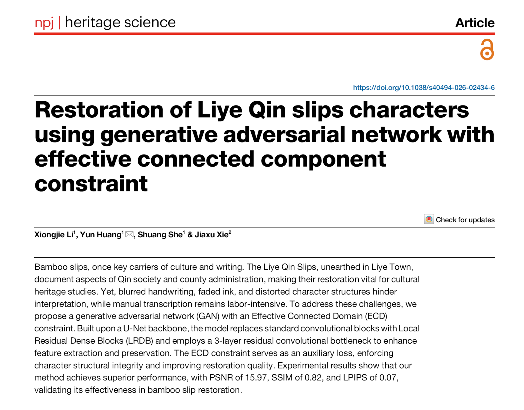 (计算机学院)近日,我院软件工程专业2023级本科生李雄杰在文化遗产国际顶级期刊《npj Heritage Science》发表题为“Restoration of Liye Qin slips characters using generative adversarial network with effective connected component constraint”的研究性论文,指导老师为我院软件工程系黄云博士。