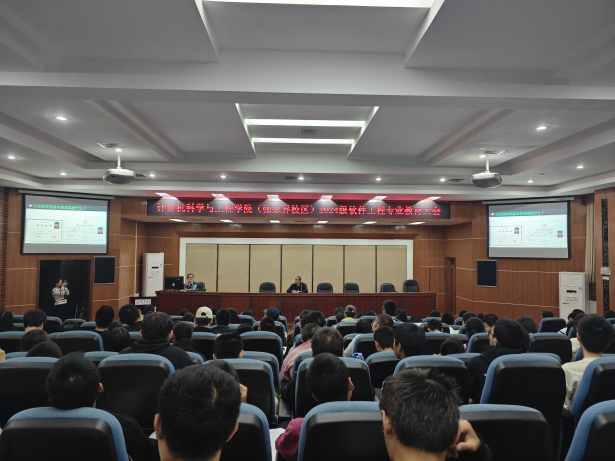 11月6日,学院在张家界校区多功能报告厅举行了软件工程专业教育大会,软件工程专业2024级所有新生参会,参会的领导老师有学院副院长张延亮博士、徐洪智教授、丁雷教授、曾明星研究员、康国栋博士、黄云博士、软件工程系主任颜一鸣副教授、教务办游小娟老师、学工办谢克来老师。本次大会由副院长覃遵跃教授主持,旨在为新入学的2024级软件工程专业学生提供全面、深入的专业教育和学业指导。