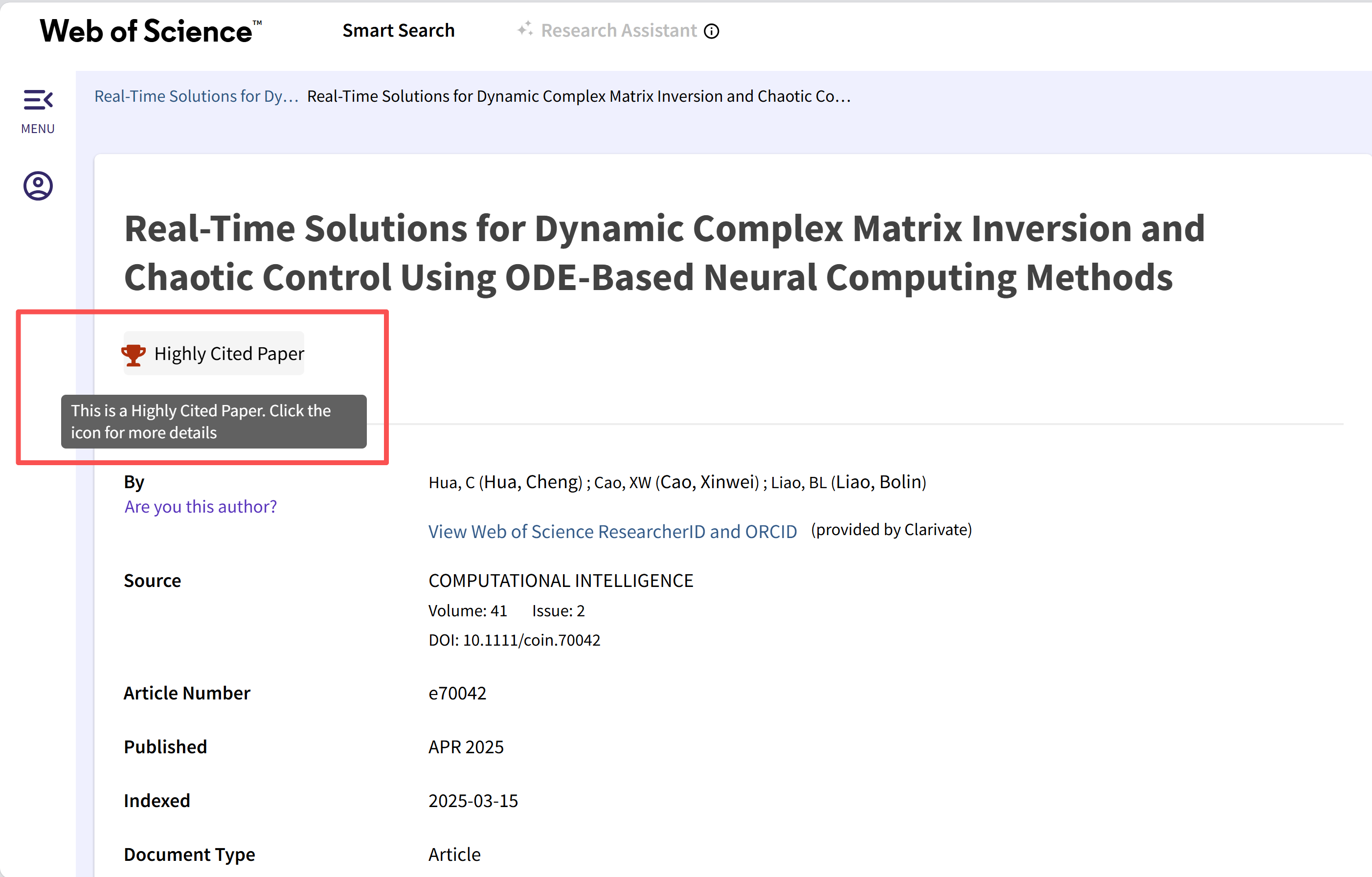 近日,学院多智能体研究与应用团队于2025年在国际SCI期刊Computational Intelligence上发表的研究论文Real-Time Solutions for Dynamic Complex Matrix Inversion and Chaotic Control Using ODE-Based Neural Computing Methods,成功入选ESI全球“高被引论文”(Highly Cited Papers)。学院教师华成为第一作者,廖柏林教授为通讯作者。目前是学院作为第一作者单位的首篇高引论文。