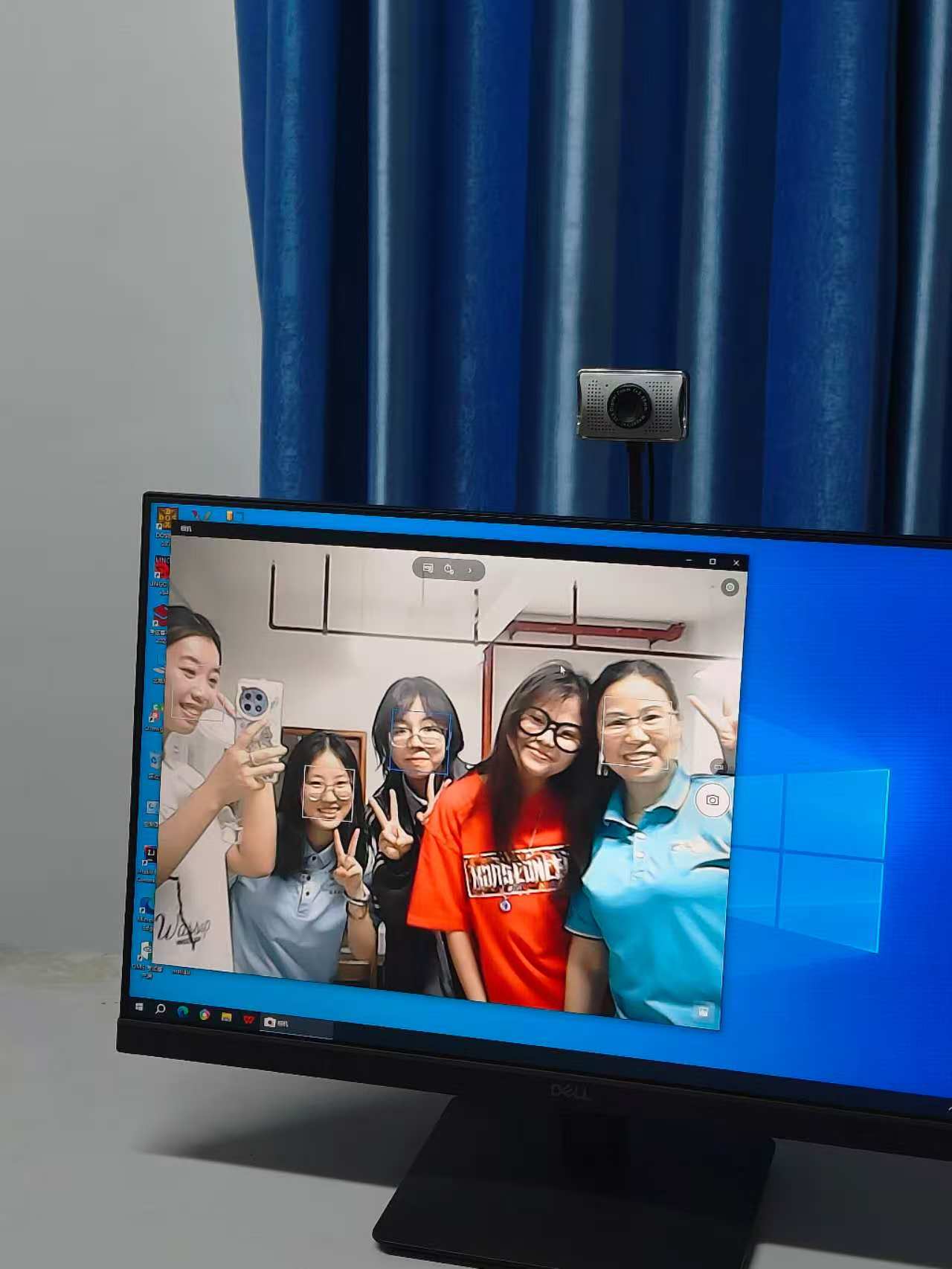 (图为比赛前调试设备时张扬英和老师、朋友的合照)