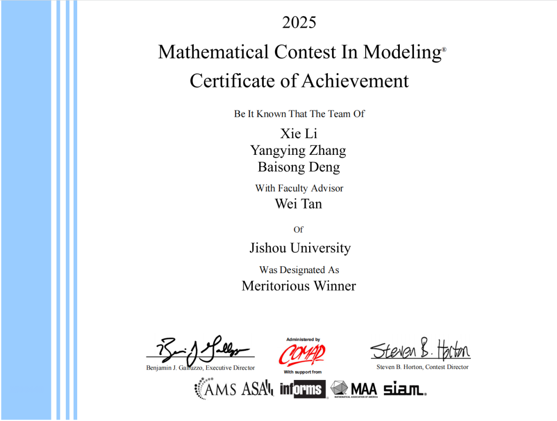 (图为张扬英和数学与统计学院的两位队友获美国大学生数学建模竞赛(MCM/ICM)Meritorious奖)