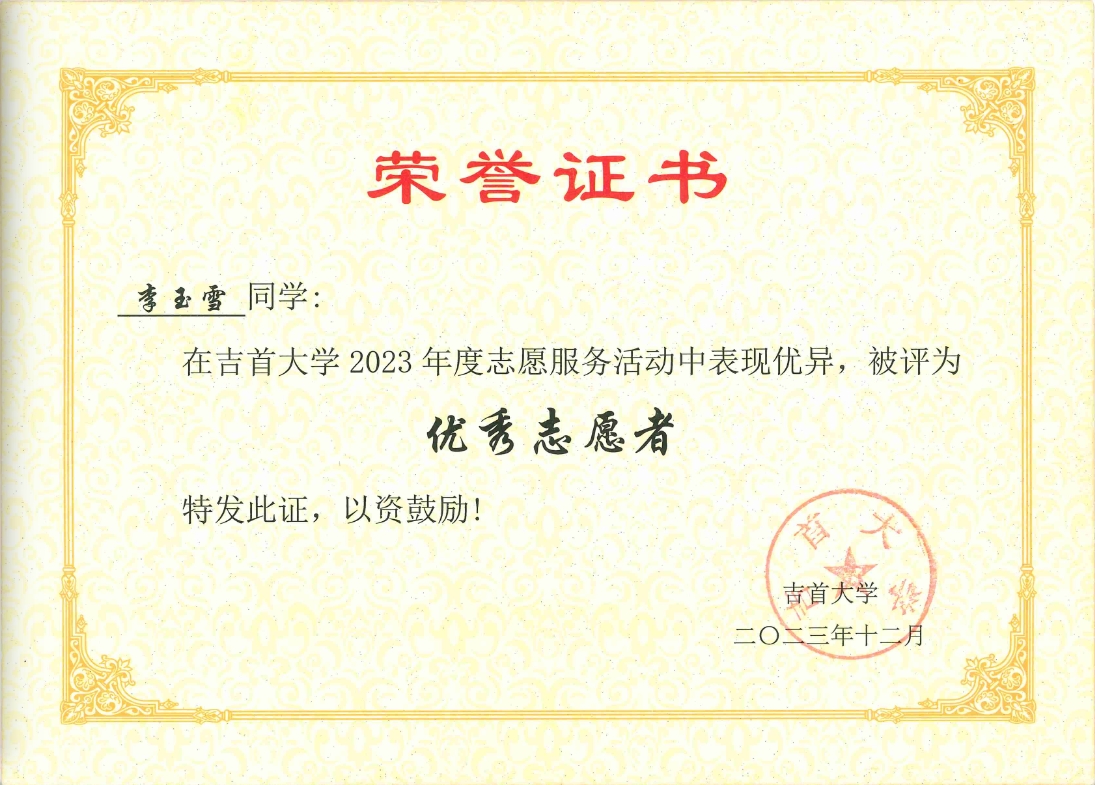 2023年暑假,她响应号召参加由田家炳基金会支持、科技教育协会·春雷公益主办的“ESS科学夏令营”乡村支教活动,赴张家界市桑植县茅岩河镇小学支教七天。她担任科学与美术老师,用科学实验激发孩子好奇心,用画笔引导孩子描绘梦想。七天支教让她体会到公益是双向治愈与成长,是“用一个灵魂去唤醒另一个灵魂”的过程。因支教表现突出,她获“优秀志愿者”称号,又因日常持续投身志愿服务,荣获校级优秀志愿者荣誉,展现了新时代青年的社会责任感。