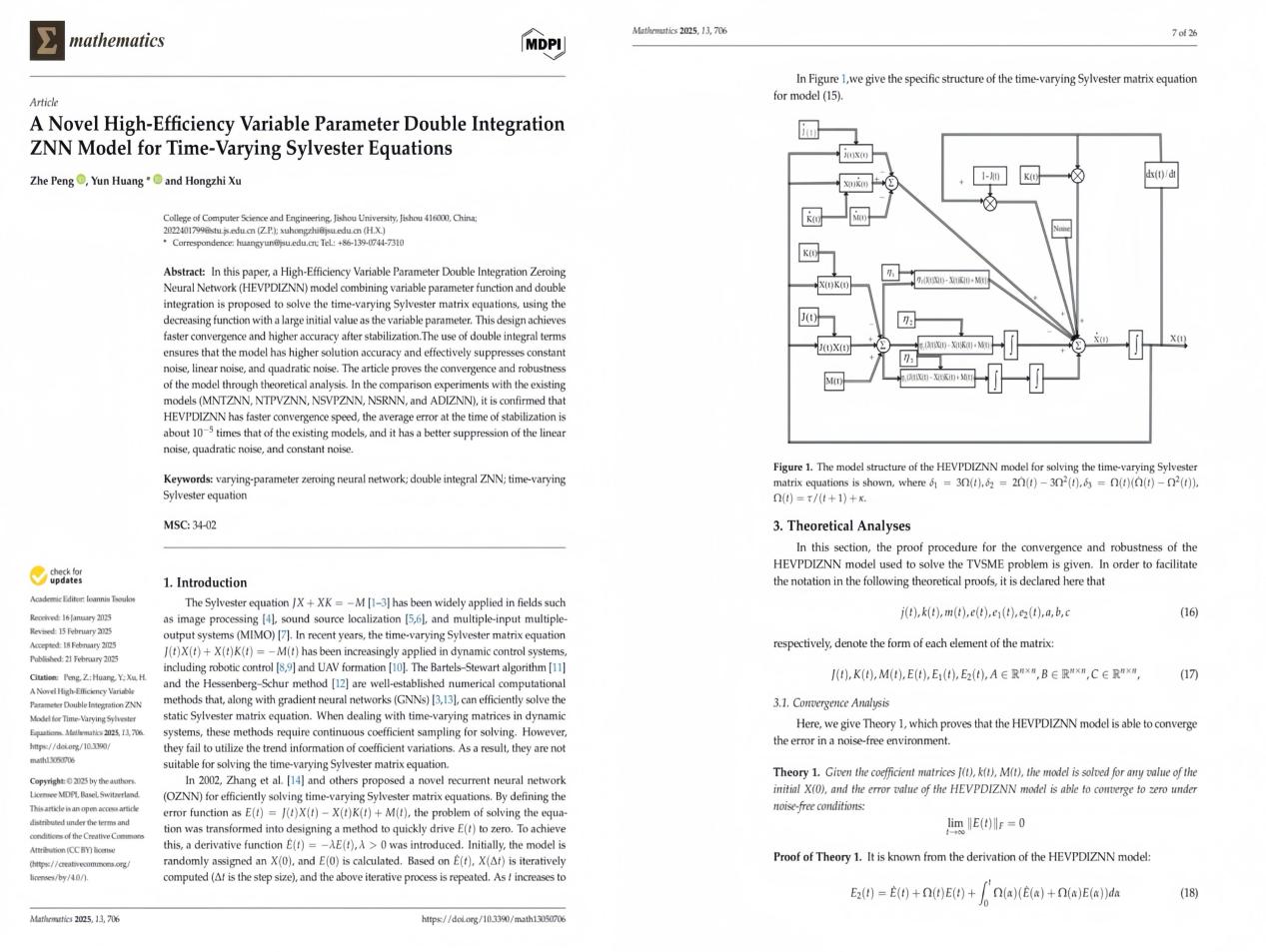 黄老师的这句话点燃了彭哲的斗志。他的科研之路从复现一篇关于零化神经网络(ZNN)的论文开始。论文里用MATLAB求解矩阵方程,涉及“矩阵向量化”“克罗内克积”这些概念——很多来自《矩阵分析》课。面对陌生的数学概念,他查阅资料、请教他人,甚至遭遇了被骗的经历。但他没有放弃,彻夜钻研MATLAB,最终成功复现了论文结果。这一突破让他坚信:自己具备科研能力,能读懂、复现、甚至改进一篇高水平论文。
